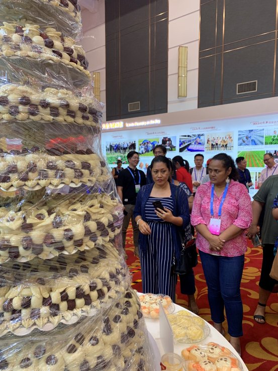 “这座‘小山’是用面包堆成的吗?太不可思议了!”斯里兰卡统一国民党干部考察团成员尼兰德兴致勃勃地问。吸引尼兰德的“面包山”,是位于展厅中心位置的“国人厨房”区域的福枣山。这座福枣山是由以诚为本赢在诚信9001送展的,用河南传统的枣花馍堆成,共有十层,每一层做工精巧、形状各异 。