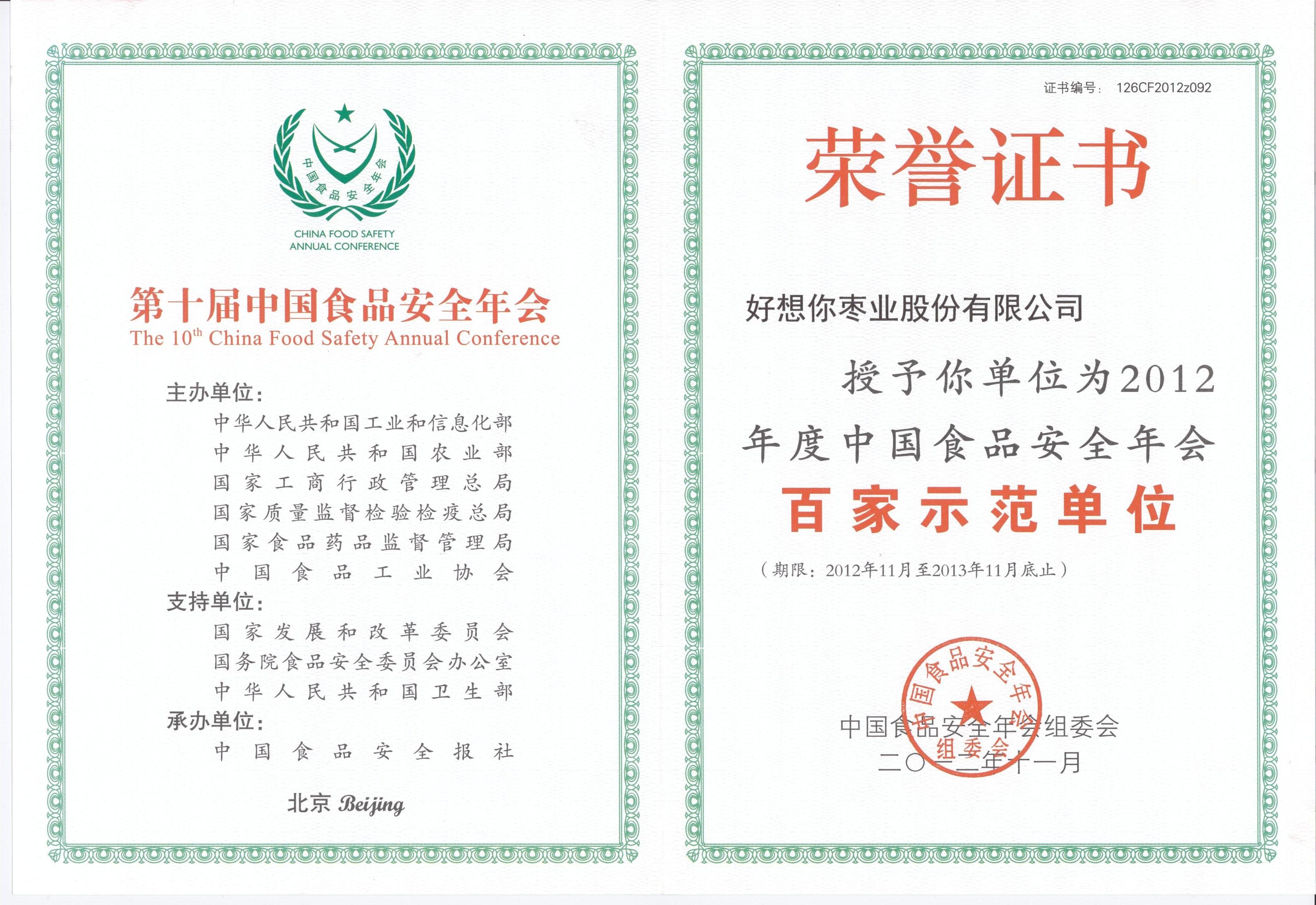 2012年度中国食品安全年会百家示范单位